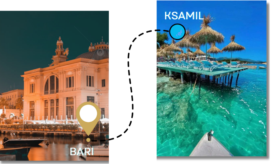 At the Bari port , travel with ferries lines “emri i kompanisë” to Vlorë, from Vlorë take the bus to Saranda ,(the line passing through the Riviera has the best view), or rent a car.. There is a coordination of timers between traveling ferries and traveling busses. While traveling to Ksamil and want to enjoy the Riviera car renting agencies offer a mapped guide so that you get the best of the experience..